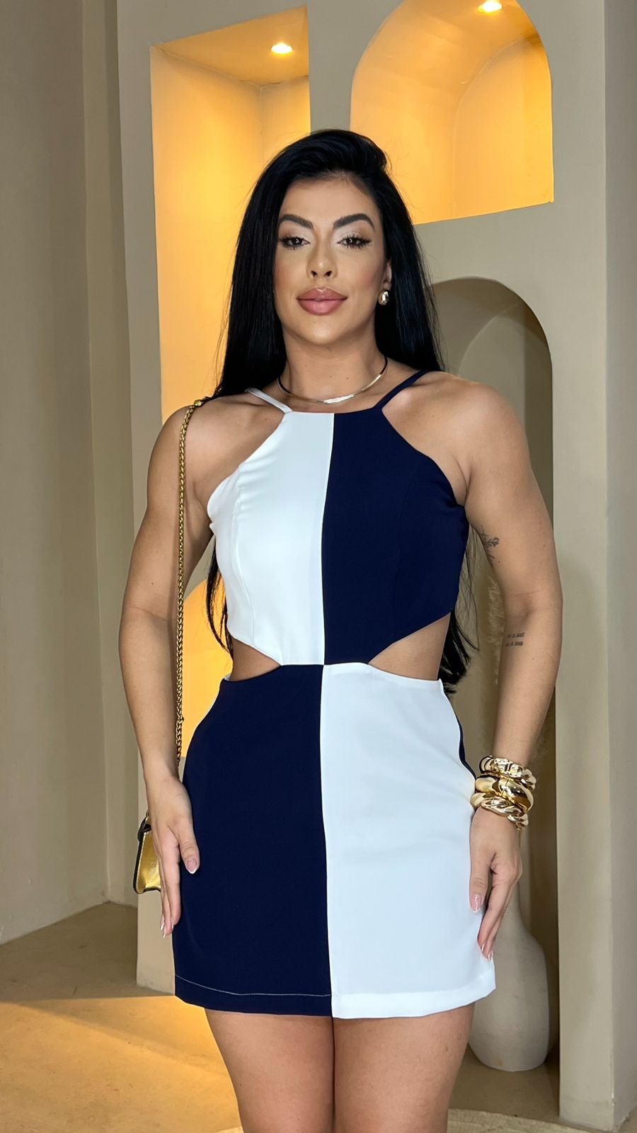 A peça conta com zíper lateral que facilita o vestir, alças ajustáveis e amarração nas costas, proporcionando um ajuste perfeito ao corpo. O design em blocos de cores cria um visual atual e versátil, ideal para diversas ocasiões, desde passeios diurnos até eventos mais descontraídos.